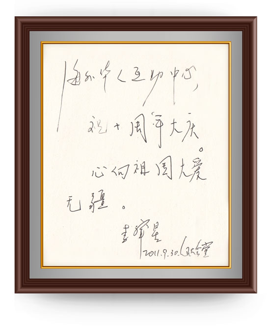 领导的题词,永远的鼓励--海外华人互助中心成立十周年之际,外交部李肇星部长的题词鼓励「心向祖国,大爱无疆 」