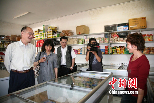 中国国务院侨办副主任赵阳(左一)在永丰海鲜蔬菜店内向店主询问店铺的面积、蔬菜的种类及价格
