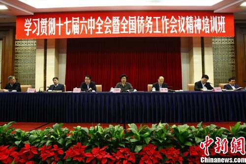 21日,国务院侨办在此间举办“学习贯彻十七届六中全会暨全国侨务工作会议精神培训班”。来自全国各省、自治区、直辖市侨办和副省级城市侨办主任、副主任,国务院侨办机关处级以上干部及直属单位领导班子成员共170人参加培训。